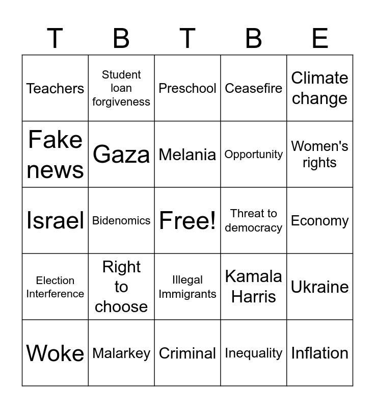 This bingo card has a free space and 39 words: China, Convicted felon, Hunter Biden, Kamala Harris, Ukraine, Election Interference, Bidenomics, Crooked Joe Biden, Threat to democracy, Economy, Fake news, Student loan forgiveness, Billionaires must pay their fair share, Women's rights, Israel, Right to choose, Illegal Immigrants, Ceasefire, Tremendous, Woke, Gaza, Melania, Inequality, Climate change, Humanitarian response, Malarkey, Criminal, Rural, Jobs, Teachers, Education, Future, Opportunity, Inflation, Food, Child care, Preschool, Families and Parent.