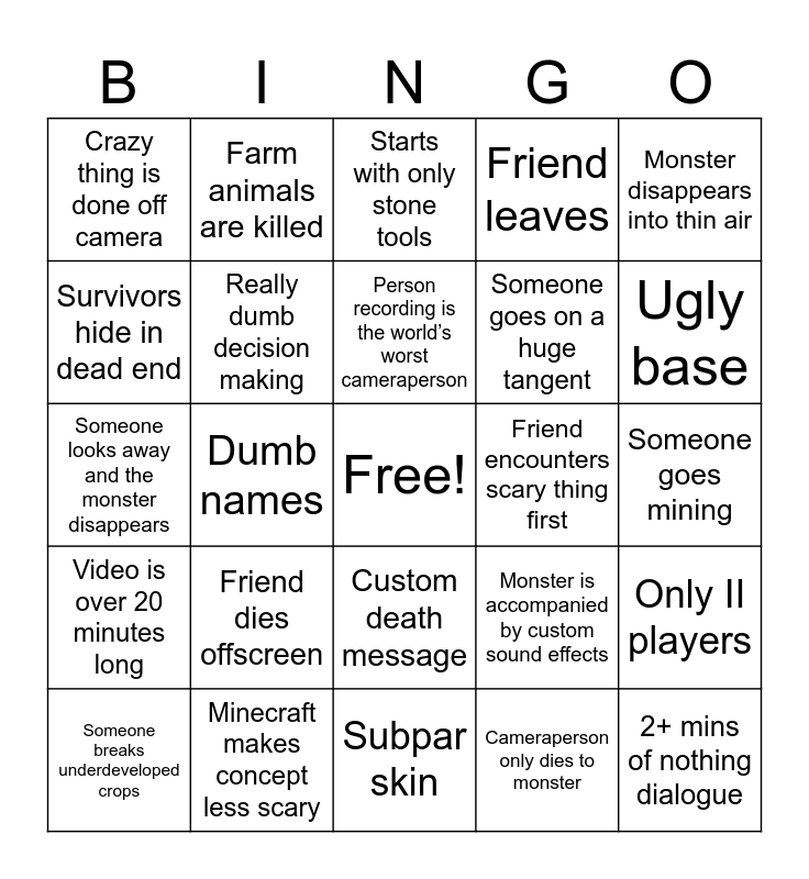 This bingo card has a free space and 45 words: Abrupt ambiance change, 2+ mins of nothing dialogue, Weirdly written dialogue, Someone breaks underdeveloped crops, Can’t skip night, Cameraperson only dies to monster, Starts with only stone tools, Obviously playing on peaceful, Monster disappears into thin air, Minecraft makes concept less scary, Friend leaves, Friend encounters scary thing first, Custom death message, Friend dies offscreen, Goofy sound effect as something scary happens, Subpar skin, Noise ruins decent scare, Someone looks away and the monster disappears, Camera person is last one standing, Ugly base, Farm animals are killed, Multiplayer server, Survivors hide underground, Crazy thing is done off camera, Bad grammar, Someone goes mining, Goofy monster design, Person sneaks around for no reason, Monster is accompanied by custom sound effects, Video is over 20 minutes long, Video ends on a jumpscare, Only II players, 7~ min gap between scares, Mine is built around house, Monster only appears in full in the last 10 min, Dumb names, Death is permanent, Friends get hostile with each other, Animal that is clearly controlled by a person, Person recording is the world’s worst cameraperson, Survivors hide in dead end, Someone goes on a huge tangent, Never mine ores on camera, Really dumb decision making and Ignores basic Minecraft mechanics.