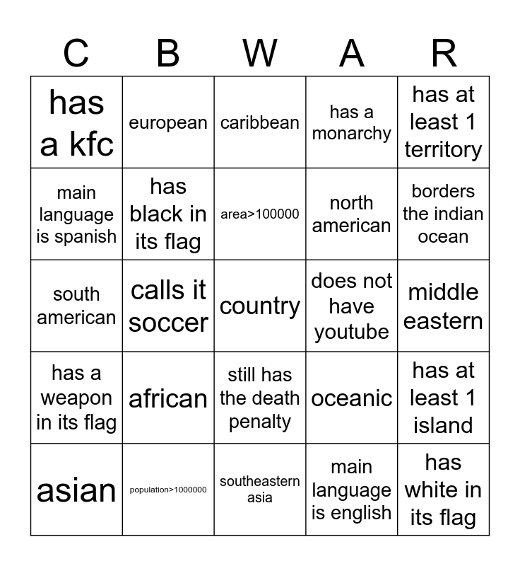 This bingo card has a free space and 24 words: african, population>1000000, area>100000, asian, has at least 1 territory, has a kfc, main language is spanish, european, does not have youtube, still has the death penalty, north american, south american, oceanic, has at least 1 island, has black in its flag, main language is english, middle eastern, caribbean, borders the indian ocean, calls it soccer, has white in its flag, has a weapon in its flag, has a monarchy and southeastern asia.