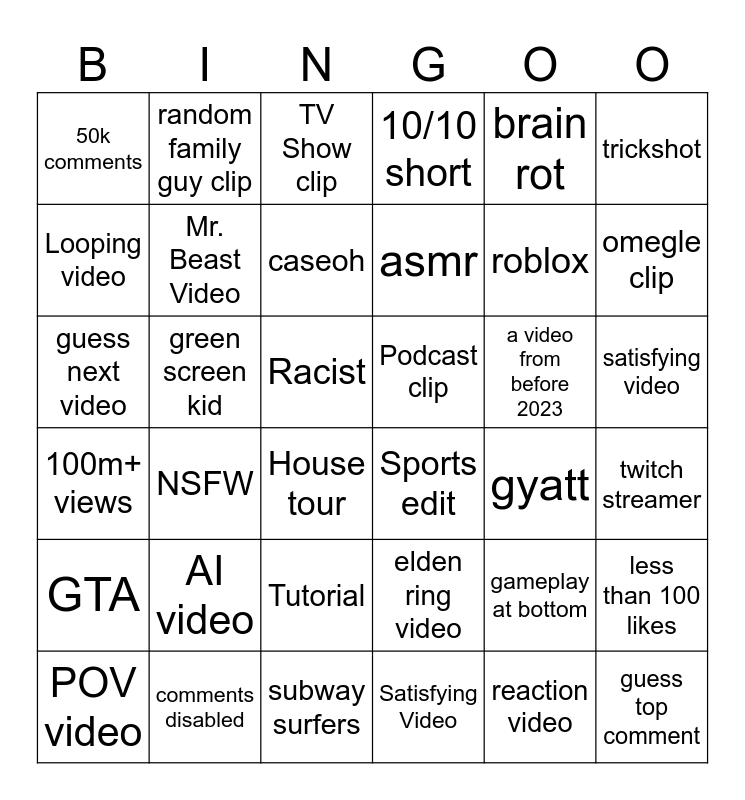 This bingo card has 36 words: elden ring video, Tutorial, Satisfying Video, Looping video, 100m+ views, Podcast clip, Mr. Beast Video, subway surfers, brain rot, gameplay at bottom, omegle clip, 10/10 short, less than 100 likes, green screen kid, asmr, 50k comments, GTA, a video from before 2023, guess next video, TV Show clip, Racist, NSFW, Sports edit, House tour, gyatt, random family guy clip, roblox, comments disabled, caseoh, trickshot, guess top comment, POV video, twitch streamer, satisfying video, AI video and reaction video.