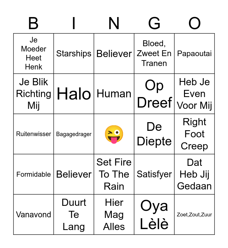 This bingo card has a free space and 39 words: Een Crush op, Duimpje Omhoog, Ho Hey, Halo, Vanavond, Set Fire To The Rain, Human, Frans Duits, Papaoutai, Formidable, Bagagedrager, Bloed, Zweet En Tranen, Zoet,Zout,Zuur, Right Foot Creep, De Diepte, Believer, De Laatste, Je Moeder Heet Henk, Parmezaanse Kaas, Satisfyer, Je Blik Richting Mij, Hier Mag Alles, Op Dreef, Heb Je Even Voor Mij, Als Ik Boven OP De Dom Sta, Utreg Me Stadje, Scars To Your Beautiful, Het Is Een Nacht, Hoe Lang Is Een Chinees, Starships, Ga Naar De Gym, NIGHTS, Believer, Duurt Te Lang, Oya Lèlè, Sugardaddy, Dat Heb Jij Gedaan, Ruitenwisser and Krantenwijk.