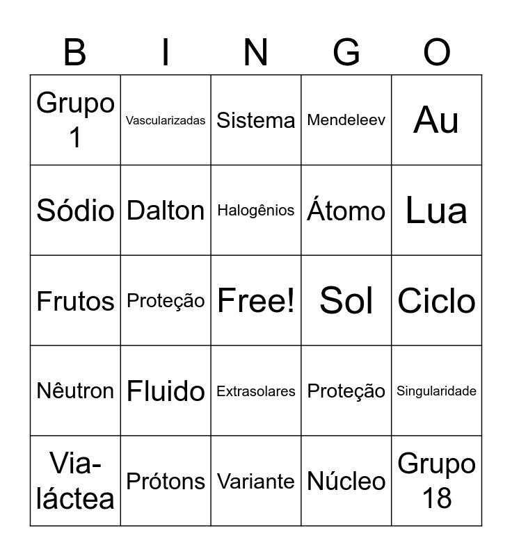 This bingo card has a free space and 60 words: Elétron, Prótons, Bohr, Nêutron, Núcleo, Próton, Dalton, Prótons, Átomo, Thomson, Mendeleev, Oxigênio, Sódio, Metais, Hidrogênio, Grupo 1, Grupo 18, Au, Oganessônio, Halogênios, Sol, Sistema, Via-láctea, Singularidade, Origem, Marte, Saturno, Rochas, Lua, Gelo, Síntese, Folhas, Pigmento, Raízes, Vascularizadas, Reprodução, Embriões, Proteção, Flor, Frutos, Poros, Fluido, Ciclo, Epífitas, Proteção, Estrelas, Explosão, Hidrogênio, Fusão, Extrasolares, Variante, Peso, Thomson, Ligações, Ferro, Einstein, Absorção, Divisão, Fotossíntese and Última.