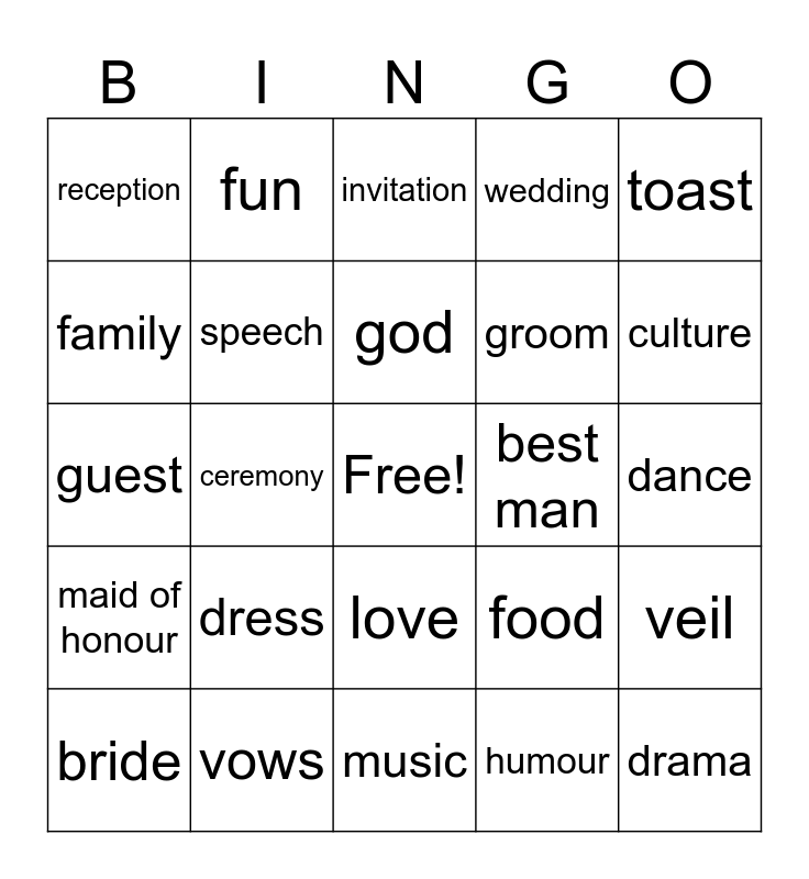 This bingo card has a free space and 29 words: bride, couple, ceremony, celebration, reception, invitation, speech, dress, best man, vows, dance, drama, music, humour, culture, gift, love, maid of honour, toast, guest, food, tradition, groom, family, wedding, fun, veil, god and smile.