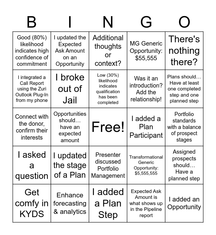 This bingo card has a free space and 47 words: Presenter answered their own rhetorical question, I added an Opportunity, I added a Plan, I added a Plan Step, I updated the stage of a Plan, I updated the Call Report Template in Outlook, I updated the Expected Ask Amount on an Opportunity, I updated my KYDs tiles to make Prospect Status show up, I integrated a Call Report using the Zuri Outlook Plug-In from my phone, I added a Plan with type 'Transformational Gift', I broke out of Jail, MG Generic Opportunity: $55,555, Assigned prospects should… Have a planned step, Transformational Generic Opportunity: $5,555,555, Data Governance is not a club to exact revenge, Myth: it's 'my' data, Low (30%) likelihood indicates qualification has been completed, I added a Plan Participant, Data Governance is definition and oversight, There's nothing there?, Opportunities should… have an expected amount, Expected Ask Amount is what shows up in the Pipeline report, Good (80%) likelihood indicates high confidence of commitment, Was it an introduction? Add the relationship!, For Moves Management it's important to file Plan Steps, Plans should… Have at least one completed step and one planned step, Get comfy in KYDS, Myth: I can keep my data secure, Presenter discussed Portfolio Management, I asked a question, Expected Ask Date = Date you expect gift in that FY, Strengthen next campaign, Opportunity likelihood discounts the expected amount, Opportunities should… have a likelihood, Plan status comes from the most recently completed plan step, Enhance forecasting & analytics, Portfolio standards with a balance of prospect stages, No completed plan step = no plan status, Make your plan a PLAN, Data completeness in KYDs, Opportunity status indicates how close we are to closing the gift, Additional thoughts or context?, Connect with the donor, confirm their interests, Data Governance is not "fixing the data", I added a Plan Step with Stage Cultivation, I added a Plan Step with Stage Solicitation and I added a Plan Step with Stage Negotiation.