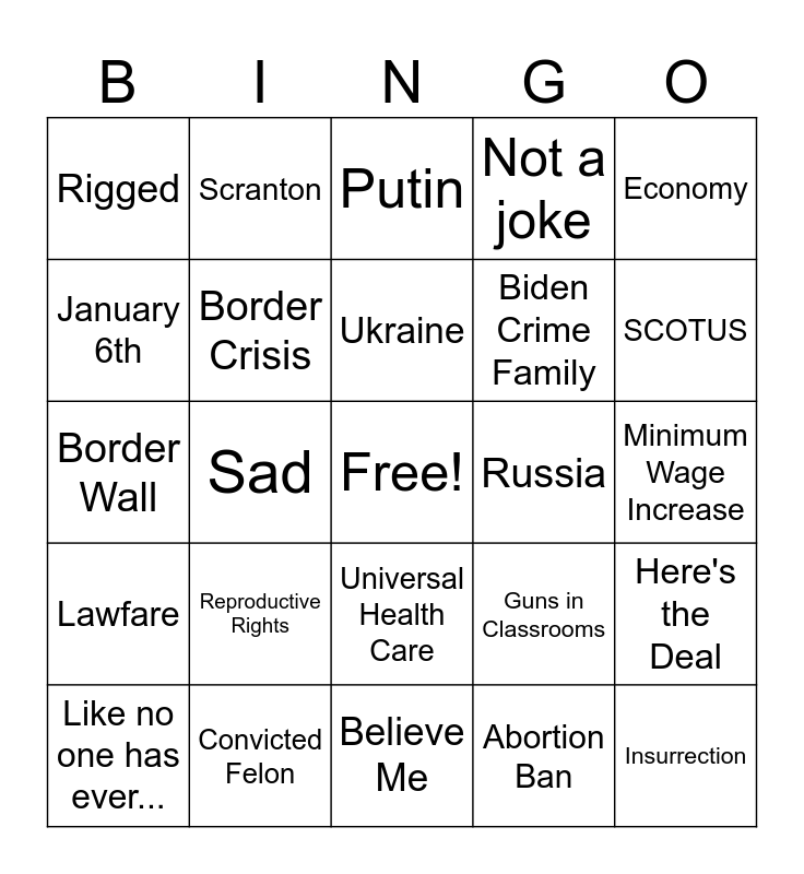 This bingo card has a free space and 59 words: Student loan forgiveness, Convicted Felon, Fake News, Lawfare, Abortion Ban, Project 2025, Border Crisis, Melania, Biden Crime Family, Woke, Not a joke, Medicare, January 6th, Climate Change, C'mon Man!, Rigged, Insurrection, Economy, China, Ukraine, Russia, Putin, Like no one has ever..., Here's the Deal, Roe vs Wade, Secure our Elections, The Fact is..., Affordable Housing, SCOTUS, Race Theory, Witch Hunt, Illegal Immigration, The American People, Listen Folks, Scranton, Tremendous, Winning, Sad, Tax Cuts, Border Wall, Shrinkflation, Reproductive Rights, Minimum Wage Increase, Truth Social, Hunter Biden, Inflation, MAGA, I'm Very Smart, Universal Health Care, Believe Me, Malarkey, Fraud, Divisive, Gun Control, Trans Rights, Guns in Classrooms, Muslim Ban, Working Class and TikTok.