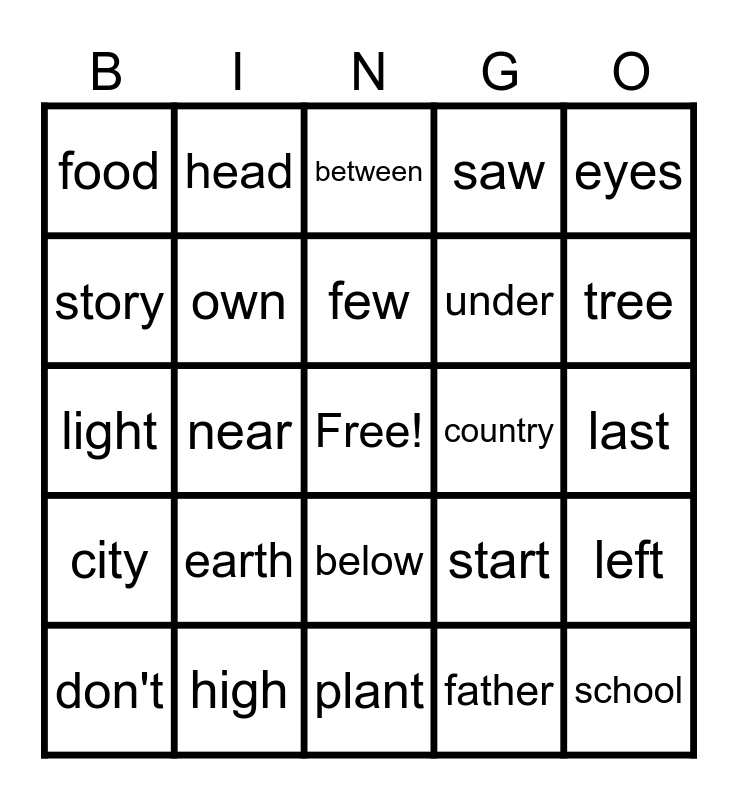 This bingo card has a free space and 30 words: high, every, near, add, food, between, own, below, country, plant, last, school, father, keep, tree, never, start, city, earth, eyes, light, thought, head, under, story, saw, left, don't, few and while.