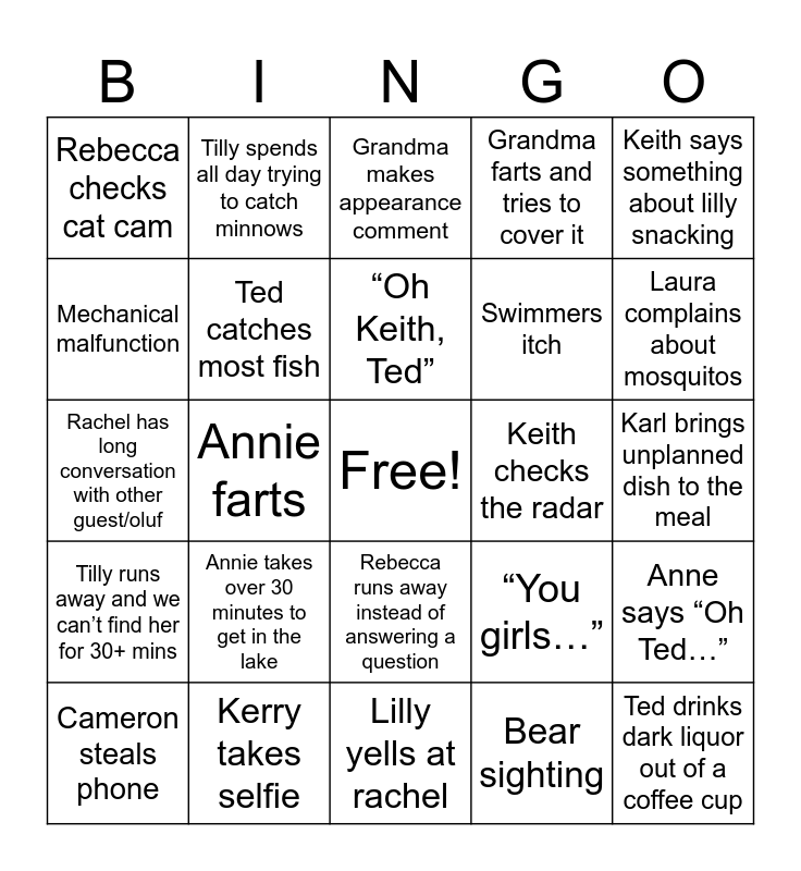 This bingo card has a free space and 36 words: You didn’t tell me that, Lilly and Keith fight, Cameron doesn’t eat dinner, Ted catches most fish, “You girls…”, Tilly runs away and we can’t find her for 30+ mins, “Oh Keith, Ted”, Tick, Keith says something about lilly snacking, You’re going into town AGAIN?, Annie farts, Grandma farts and tries to cover it, Comment about white caps, Keith checks the radar, Laura complains about mosquitos, Rebecca checks cat cam, Ted makes a comment about Dan, Annie takes over 30 minutes to get in the lake, Ted drinks dark liquor out of a coffee cup, Grandma makes appearance comment, Karl brings unplanned dish to the meal, Anne says “Oh Ted…”, Kerry takes selfie, Cameron steals phone, Lilly yells at rachel, Tilly spends all day trying to catch minnows, Rachel has long conversation with other guest/oluf, Kerry lies about her showering, Swimmers itch, Mechanical malfunction, Gets sunburned, Cameron gets his regular pants soaking wet, Bear sighting, Rebecca runs away instead of answering a question, Dan comes and Ted inappropriate joke.
