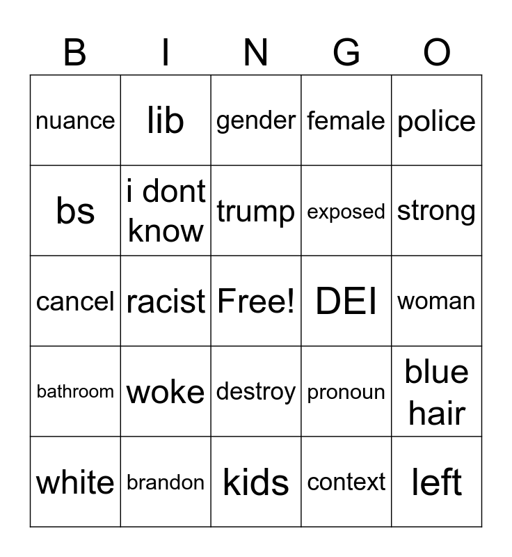 This bingo card has a free space and 24 words: woke, brandon, trump, white, police, nuance, bs, lib, DEI, destroy, exposed, cancel, pronoun, blue hair, i dont know, context, woman, gender, strong, racist, left, bathroom, female and kids.