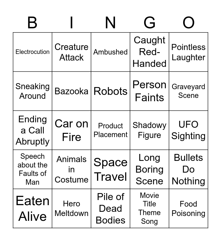 This bingo card has 27 words: Long Boring Scene, Food Poisoning, Person Faints, Pile of Dead Bodies, Sneaking Around, Ambushed, Creature Attack, Speech about the Faults of Man, Shadowy Figure, Bullets Do Nothing, Ending a Call Abruptly, Caught Red-Handed, Eaten Alive, Hero Meltdown, Graveyard Scene, Zombies, Bazooka, Robots, Animals in Costume, Electrocution, UFO Sighting, Movie Title Theme Song, Car on Fire, Product Placement, Space Travel, Pointless Laughter and Cape in Front of Face.