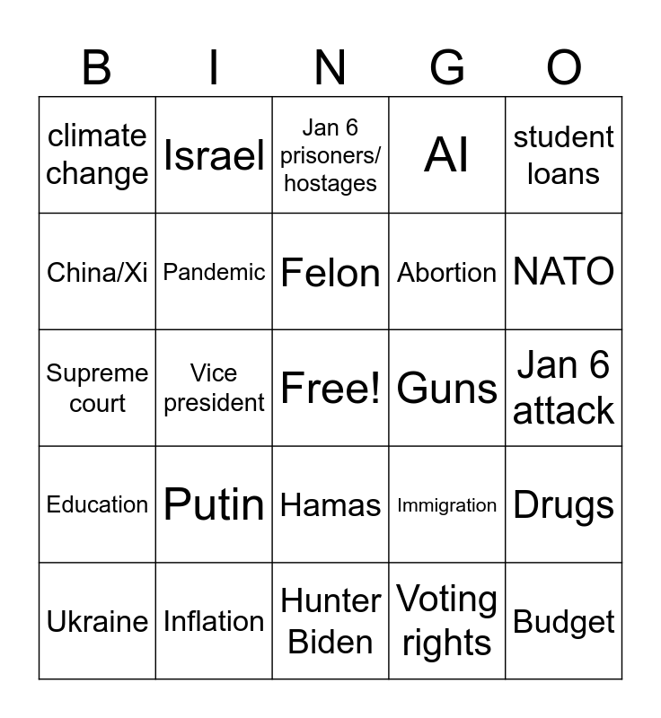 This bingo card has a free space and 24 words: Putin, Inflation, Felon, Ukraine, student loans, climate change, China/Xi, Israel, Guns, Hamas, Abortion, Supreme court, Immigration, Drugs, Pandemic, Voting rights, Jan 6 attack, Jan 6 prisoners/ hostages, NATO, Vice president, Budget, Education, AI and Hunter Biden.