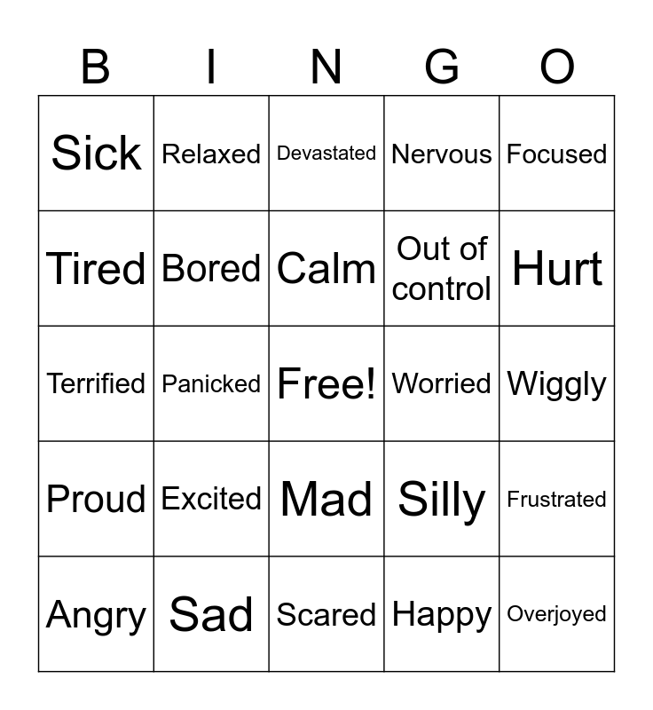 This bingo card has a free space and 24 words: Excited, Sad, Calm, Angry, Focused, Sick, Tired, Relaxed, Worried, Mad, Out of control, Terrified, Silly, Frustrated, Bored, Happy, Wiggly, Devastated, Hurt, Panicked, Overjoyed, Proud, Nervous and Scared.