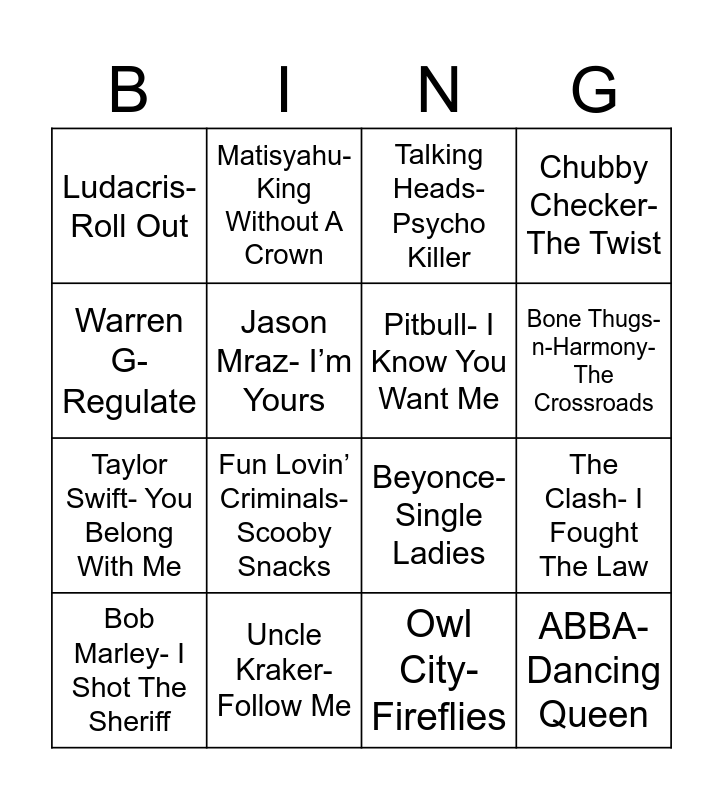 This bingo card has 24 words: White Stripes- We’re Going To Be Friends, Garth Brooks- Friends in Low Places, Bone Thugs-n-Harmony- The Crossroads, Ying Yang Twins- Get Low, Warren G- Regulate, Ludacris- Roll Out, Jason Mraz- I’m Yours, Matisyahu- King Without A Crown, Uncle Kraker- Follow Me, Ray LaMontagne- You Are The Best Thing, Taylor Swift- You Belong With Me, Beyonce- Single Ladies, Kings of Leon- Use Somebody, Jamie Foxx/T Pain- Blame It, Pitbull- I Know You Want Me, Katy Pears- Hot n Cold, Owl City- Fireflies, Talking Heads- Psycho Killer, Fun Lovin’ Criminals- Scooby Snacks, The Clash- I Fought The Law, Bob Marley- I Shot The Sheriff, ABBA- Dancing Queen, Chubby Checker- The Twist and Walk The Moon- Shut Up & Dance With Me.