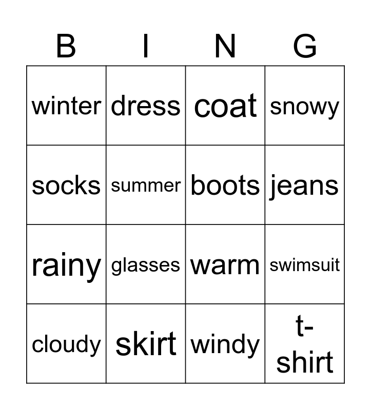 This bingo card has 32 words: shoes, pajamas, swimsuit, sweater, t-shirt, boots, socks, pants, dress, shorts, jeans, coat, jacket, hat, skirt, scarf, weather, warm, cold, hot, warm, cool, windy, sunny, cloudy, snowy, rainy, summer, winter, spring, fall and glasses.
