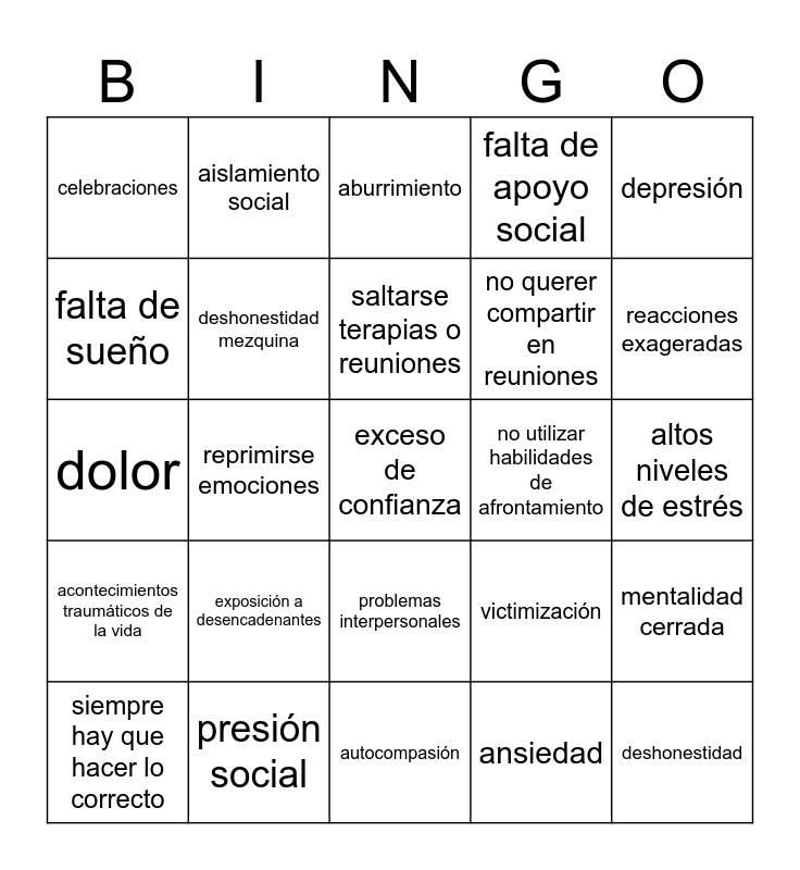 This bingo card has 25 words: acontecimientos traumáticos de la vida, presión social, exceso de confianza, ansiedad, depresión, celebraciones, aislamiento social, aburrimiento, no utilizar habilidades de afrontamiento, mentalidad cerrada, falta de sueño, deshonestidad mezquina, autocompasión, victimización, reacciones exageradas, siempre hay que hacer lo correcto, reprimirse emociones, saltarse terapias o reuniones, no querer compartir en reuniones, altos niveles de estrés, dolor, exposición a desencadenantes, problemas interpersonales, falta de apoyo social and deshonestidad.
