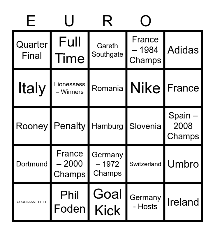 This bingo card has 101 words: Free!, 3 Lions, Adidas, Albania, Austria, Belgium, Berlin, Bukayo Saka, Cologne, Corner, Croatia, Czech Republic, Czechoslovakia – 1976 Champs, David Beckham, Denmark, Denmark – 1992 Champs, Dortmund, Dusseldorf, Engerrrrrrland, England, England loose on penalties, Extra time, Final, Flag, Football Boot, France, France – 1984 Champs, France – 2000 Champs, Frankfurt, Free Kick, Full Time, Gareth Southgate, Gazza, Gelsenkirchen, Georgia, Germany – 1972 Champs, Germany – 1980 Champs, Germany – 1996 Champs, Germany - Hosts, Goal Kick, Golden goal, GOOOAAAALLLLLLL, Greece – 2004 Champs, Group Stage, Half Time, Hamburg, Harry Kane, Hungary, Injury time, Ireland, It’s Coming Home, Italy, Italy – 1968 Champs, Italy – 2020 Champs, Jordan Pickford, Jude Bellingham, Kick off, Lederhosen, Leipzig, Linesmen, Lionessess – Winners, metatarsal, Munich, Netherlands, Netherlands – 1988 Champs, Nike, Panini Sticker Book, Penalty, Phil Foden, Poland, Portugal, Portugal – 2016 Champs, Quarter Final, Referee, Romania, Rooney, Round of 16, Scotland, Semi Final, Serbia, Shin Pad, Slovakia, Slovenia, Soviet Union – 1960 Champs, Spain, Spain – 1964 Champs, Spain – 2008 Champs, Spain – 2012 Champs, Stuttgart, Sweet Caroline, Switzerland, Throwing Beer when goal scored, Turkey, Uefa, Ukraine, Umbro, VAR, Vindaloo, Wales, Wembley and Whistle.