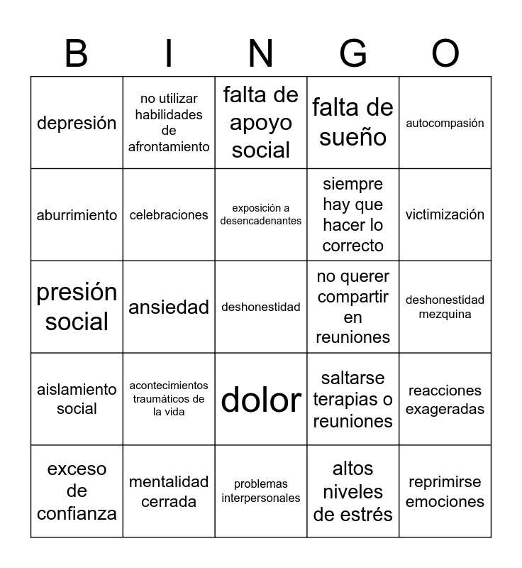 This bingo card has 25 words: aislamiento social, mentalidad cerrada, deshonestidad, altos niveles de estrés, autocompasión, depresión, no utilizar habilidades de afrontamiento, falta de apoyo social, no querer compartir en reuniones, reacciones exageradas, aburrimiento, celebraciones, problemas interpersonales, saltarse terapias o reuniones, victimización, exceso de confianza, ansiedad, exposición a desencadenantes, siempre hay que hacer lo correcto, deshonestidad mezquina, presión social, acontecimientos traumáticos de la vida, dolor, falta de sueño and reprimirse emociones.