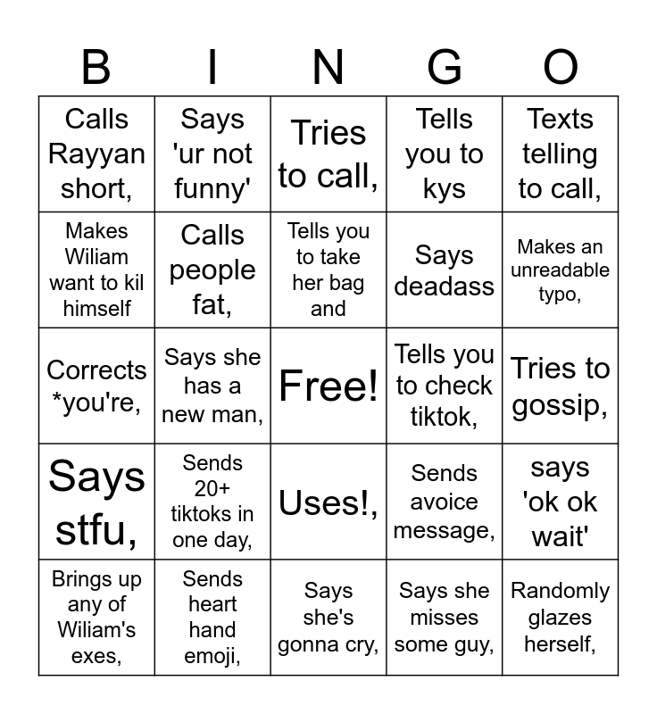 This bingo card has a free space and 29 words: Brings up any of Wiliam's exes,, Brings up any of her exes,, Says she has a new man,, Talks about food,, Calls Rayyan short,, Tries to call,, Calls people fat,, Sends 20+ tiktoks in one day,, Tells you to check tiktok,, Sends heart hand emoji,, Tries to gossip,, Randomly glazes herself,, Says she's gonna cry,, Says she misses some guy,, Makes an unreadable typo,, Makes fun of Rayyan's haircut,, Uses!,, Says stfu,, Texts telling to call,, Corrects *you're,, Sends avoice message,, Say's she's gonna kil herself,, Says deadass, Makes Wiliam want to kil himself, Tells you to kys, Says 'ur not funny', says 'ok ok wait', Tells you to take her bag and and Tells you to watch some obscure show..