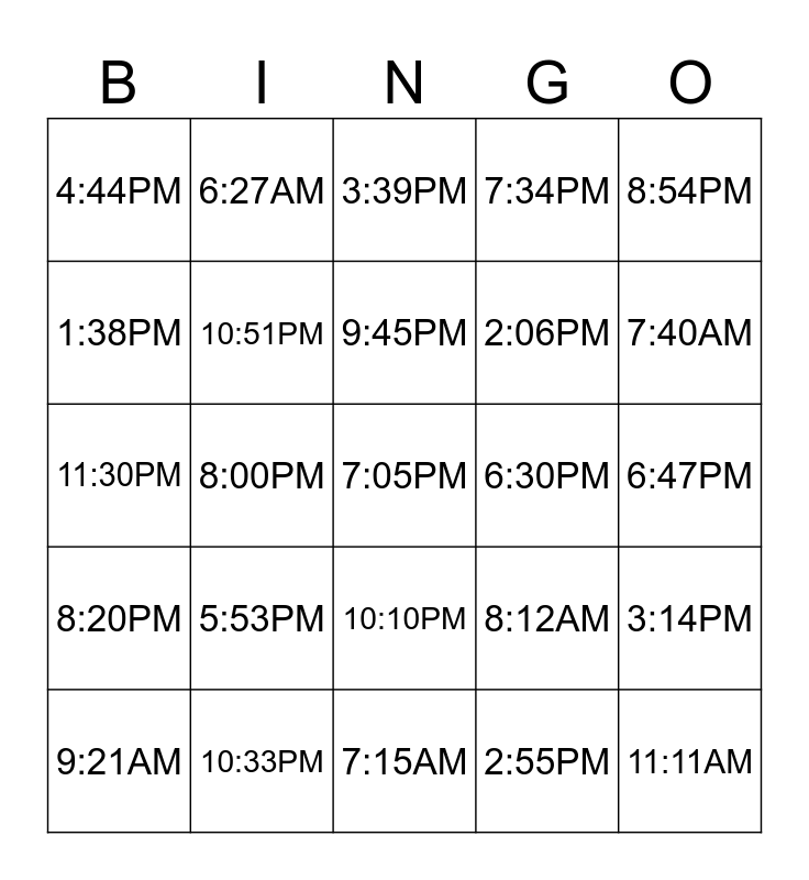 This bingo card has 40 words: 11:59PM, 11:30PM, 11:08PM, 10:51PM, 10:33PM, 10:10PM, 9:45PM, 9:07PM, 8:54PM, 8:20PM, 8:00PM, 7:34PM, 7:05PM, 6:47PM, 6:30PM, 5:53PM, 5;13PM, 4:44PM, 4:05PM, 3:39PM, 3:14PM, 2:55PM, 2:06PM, 1:38PM, 1:10PM, 12:33PM, 12:05PM, 11:45AM, 11:11AM, 10:50AM, 9:46AM, 9:21AM, 8:59AM, 8:12AM, 7:40AM, 7:15AM, 6:53AM, 10:04AM, 6:27AM and 6:00AM.