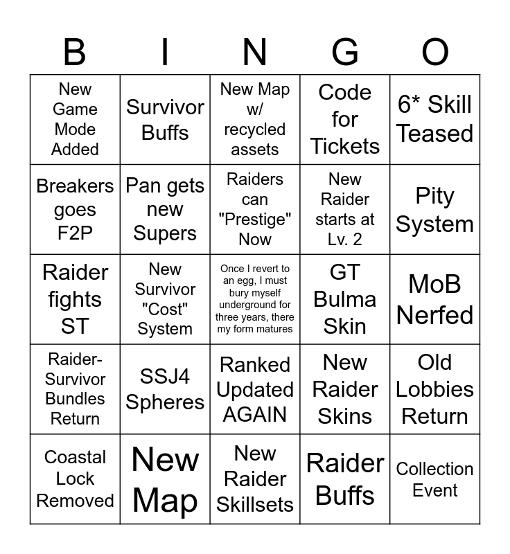This bingo card has a free space and 24 words: SSJ4 Spheres, New Map, Raiders can "Prestige" Now, Coastal Lock Removed, 6* Skill Teased, New Game Mode Added, Breakers goes F2P, Survivor Buffs, GT Bulma Skin, Ranked Updated AGAIN, New Raider starts at Lv. 2, Raider fights ST, New Raider Skins, Old Lobbies Return, Pan gets new Supers, Raider Buffs, MoB Nerfed, New Map w/ recycled assets, Pity System, New Survivor "Cost" System, Collection Event, Raider-Survivor Bundles Return, Code for Tickets and New Raider Skillsets.