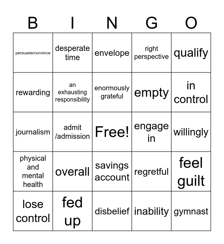 This bingo card has a free space and 63 words: a local charity, assist, financial difficulty, feel guilt, reach the point of hopelessness, a substantial amount of money, desperate time, a generous gift, enormously grateful, a student loan, savings account, wage/salary, willingly, qualify, contribute, rewarding, admit /admission, persuade/convince, tears fill my eyes, empty, overall, physical and mental health, right perspective, to smartly handle stress, instead, create a brighter future, accomplish, ought to do sth, a to-do list, unproductive comment, worthless remarks, take…for granted, an effective time management plan, among, in control, lose control, arrange affairs, inability, tiring role, an exhausting responsibility, journalism, engage in, downtown, regular schooling, gymnast, fed up, retirement, regretful, flexible schedule, strengthen, solidify, disbelief, mistrust, timetable, true side, envelope, shame, pleasant, massive, literally, craftsman spirit, bound and awesome.