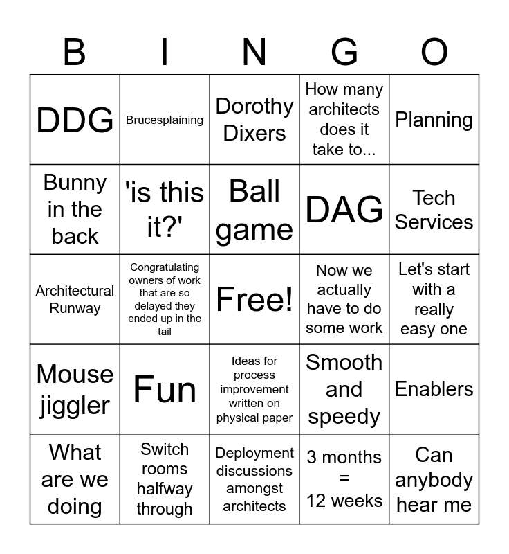 This bingo card has a free space and 24 words: Fun, Switch rooms halfway through, Ball game, What are we doing, Planning, DDG, Bunny in the back, Brucesplaining, Now we actually have to do some work, Ideas for process improvement written on physical paper, DAG, Architectural Runway, Smooth and speedy, Enablers, 'is this it?', 3 months = 12 weeks, Let's start with a really easy one, Dorothy Dixers, Tech Services, Congratulating owners of work that are so delayed they ended up in the tail, Can anybody hear me, Mouse jiggler, How many architects does it take to... and Deployment discussions amongst architects.