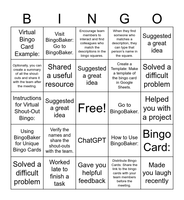 This bingo card has a free space and 88 words: tGPT 4o, Make me a shout out bingo game to use as an icebreaker for my team., ChatGPT, Sure, here's a shout-out bingo game designed as an icebreaker for your team. You can customize it further based on your team's specifics., Shout-Out Bingo, Instructions:, Distribute the bingo cards to each team member., Set a time limit (e.g., 10-15 minutes)., Team members need to find colleagues who match the descriptions in the bingo squares., When they find someone who matches a description, they write that person's name in the square., The first person to get five squares in a row (horizontally, vertically, or diagonally) shouts "Bingo!"., Verify the names and share the shout-outs with the team., Bingo Card:, Helped you with a project, Solved a difficult problem, Suggested a great idea, Gave you helpful feedback, Collaborated on a task, Feel free to adjust the categories to better fit your team dynamics and the specific roles and contributions of your team members., Make it a virtual game, ChatGPT, For a virtual shout-out bingo game, you can use an online tool like BingoBaker or create a shared document where everyone can access and fill in their bingo cards. Here’s how you can set it up:, Instructions for Virtual Shout-Out Bingo:, Create Bingo Cards: Use a tool like BingoBaker to create and customize your bingo cards. You can input the bingo items and generate a link for each team member to get their own card., Distribute Bingo Cards: Share the link to the bingo cards with your team members before the meeting., Set the Rules:, Share the rules at the beginning of the meeting., Set a time limit (e.g., 10-15 minutes) for team members to fill in their bingo cards., Playing the Game:, Use a platform like Zoom, Teams, or Google Meet for the meeting., Encourage team members to interact and find colleagues who match the descriptions in the bingo squares., When they find someone who matches a description, they can type that person’s name in the square., The first person to get five squares in a row (horizontally, vertically, or diagonally) shouts "Bingo!" in the chat., Sharing Shout-Outs:, Verify the names and share the shout-outs with the team., Optionally, you can create a summary of all the shout-outs and share it with the team after the meeting., Virtual Bingo Card Example:, Here’s an example of what your bingo card could look like:, Helped you with a project, Solved a difficult problem, Suggested a great idea, Gave you helpful feedback, Collaborated on a task, How to Use BingoBaker:, Go to BingoBaker., Create a New Bingo Card: Input the bingo items in the squares., Generate Cards: Click “Generate” to create individual cards for your team., Share the Link: Copy the link and share it with your team members., Alternative: Google Sheets, Create a Template: Make a template of the bingo card in Google Sheets., Duplicate for Each Member: Duplicate the sheet for each team member., Share the Sheets: Share the individual links with each team member., This setup allows everyone to participate interactively, even in a virtual setting., Is there free online bingo maker where the cards are different for each player?, ChatGPT, Yes, BingoBaker allows you to create unique bingo cards for each player for free. Here’s a step-by-step guide to creating and distributing different bingo cards to your team:, Using BingoBaker for Unique Bingo Cards, Visit BingoBaker: Go to BingoBaker., Create a New Bingo Card:, Click on “Create New Bingo Card.”, Enter your bingo items in the squares. Here’s a template you can use:, css, Copy code, Helped you with a project, Always has a positive attitude, Worked late to finish a task, Organized a team event, Shared a useful resource, Solved a difficult problem, Made you laugh recently, Took on extra work, Completed a certification, Worked through lunch, Suggested a great idea, Helped you learn something new, Free Space, Came up with a creative solution, Assisted a new team member, Gave you helpful feedback, Volunteered for a task, Demonstrated leadership, Is a great mentor, Helped resolve a conflict, Collaborated on a task, Shared helpful information, Has excellent communication skills, Went above and beyond and Always willing to help.