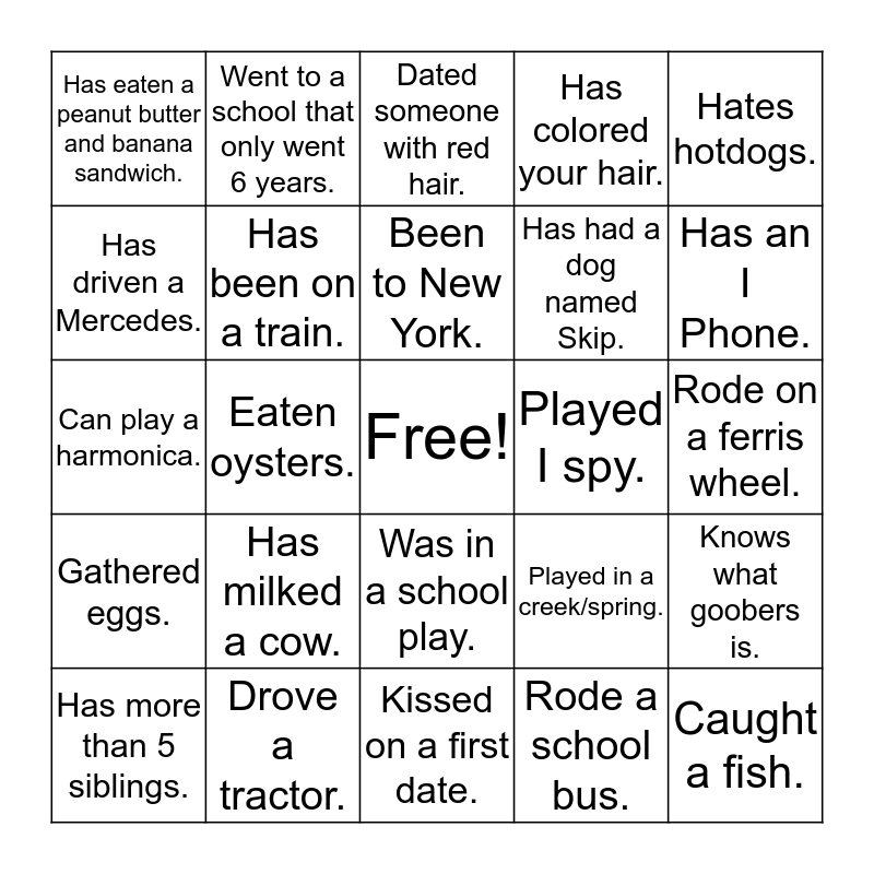 This bingo card has a free space and 24 words: Has milked a cow., Drove a tractor., Been to New York., Has more than 5 siblings., Hates hotdogs., Has eaten a peanut butter and banana sandwich., Has driven a Mercedes., Went to a school that only went 6 years., Played I spy., Was in a school play., Has had a dog named Skip., Can play a harmonica., Played in a creek/spring., Knows what goobers is., Has been on a train., Rode a school bus., Rode on a ferris wheel., Dated someone with red hair., Has an I Phone., Eaten oysters., Caught a fish., Gathered eggs., Has colored your hair. and Kissed on a first date..