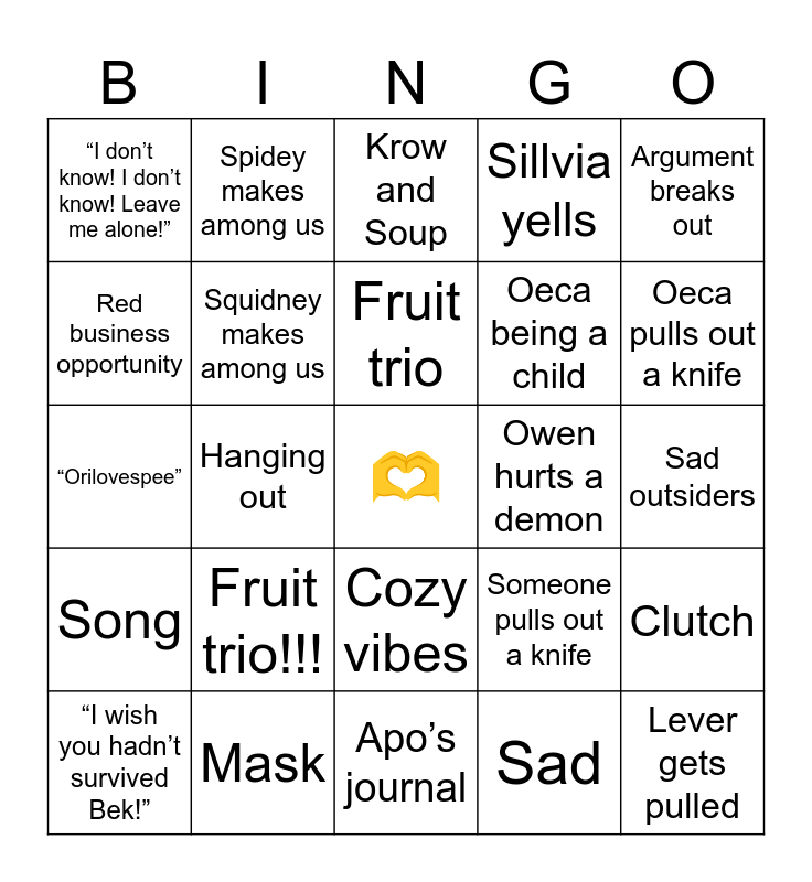 This bingo card has a free space and 77 words: Owen remembers, Owen and Apo, Krow and Soup, Angst, “Tell me do you demons bleed”, Magic and Owen, Owen gets mad, Wholesome, Wholesome Rasbi, Someone enters the maze, Someone new joins, Squidney and Mohwee hang out, Fruit trio, Red business opportunity, Cow gets killed, Hanging out, Mohwee and Oeca chaos, Lever gets pulled, Fight breaks out, Argument breaks out, Graecie, “Orilovespee”, Squidney makes among us, Spidey makes among us, Sillvia yells, Rasbi raid, Guys take, Mohwee being chaotic, Oeca being chaotic, Reddoons being chaotic, Owen being protective, Apo being protective, Red names, Someone pulls out a knife, Oeca pulls out a knife, Oeca being a child, Someone being a villain, Gayness, Sad outsiders, Sad, “Sit down”, “Your a disease on the face of this earth”, “I can ensure you I have done worst”, “All three of you left me to die”, “I’d do it again”, “I’m gonna kill you Apo! You deserve this”, “I wish you hadn’t survived Bek!”, “I don’t know! I don’t know! Leave me alone!”, Someone dies, Someone goes missing, Rasbi panics, Cozy vibes, Owen and Mohwee, Apo and Owen Angst, Graecie raid, Owen raid, Owen and Magic, Soft Owen, Krow raid, Bek raid, Fruit trio!!!, Fruit trio makes food, Someone gets hurt, Villain arc, Squidney snaps, Graecie snaps, Krow gets hurt, Owen hurts a demon, Goggle duo, Funny moment lol, Someone pulls out a knife, Clutch, Song, Mask, A secret reveals, Apo’s journal and Someone gets blamed for something they didn’t do.