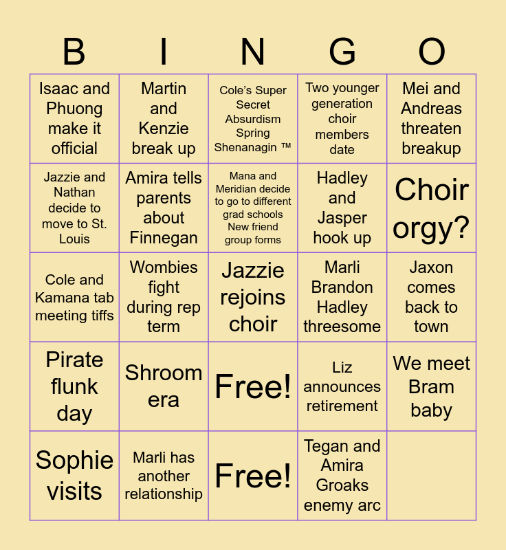 This bingo card has 25 words: Free!, Sophie visits, Wombies fight during rep term, Cole and Devan hook up, Two younger generation choir members date, Mei and Andreas threaten breakup, Isaac and Phuong make it official, Martin and Kenzie break up, Jazzie rejoins choir, Liz announces retirement, Choir orgy?, Jazzie and Nathan decide to move to St. Louis, Marli has another relationship, Free!, Hadley and Jasper hook up, We meet Bram baby, Cole and Kamana tab meeting tiffs, Amira tells parents about Finnegan, Mana and Meridian decide to go to different grad schools New friend group forms, Marli Brandon Hadley threesome, Jaxon comes back to town, Pirate flunk day, Shroom era, Cole’s Super Secret Absurdism Spring Shenanagin ™️ and Tegan and Amira Groaks enemy arc.