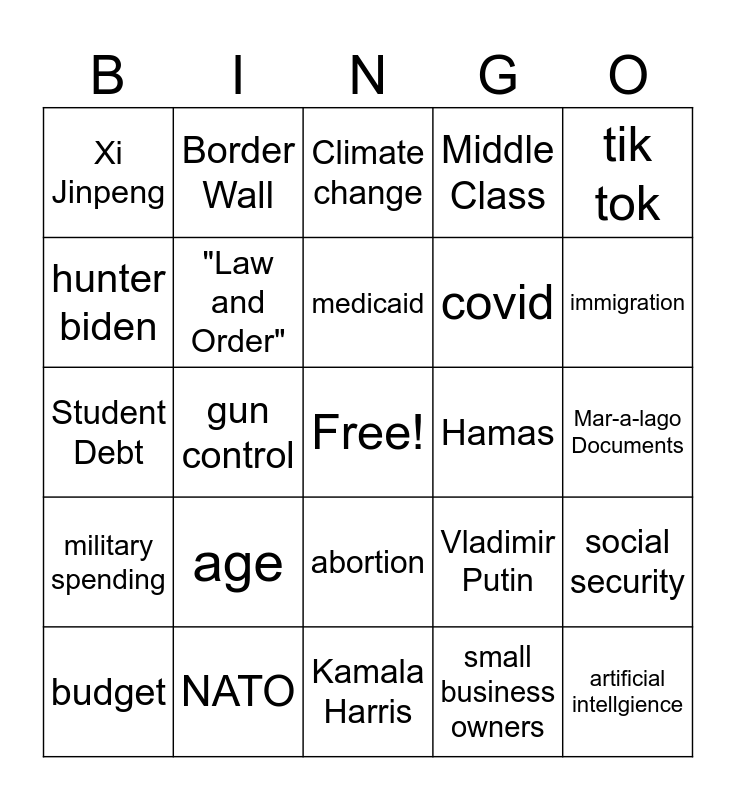 This bingo card has a free space and 29 words: budget, supreme court, gun control, fentanlyl, Xi Jinpeng, Climate change, "Law and Order", age, Hamas, NATO, Mar-a-lago Documents, artificial intellgience, Kamala Harris, small business owners, immigration, January 6th, abortion, military spending, tik tok, Student Debt, Vladimir Putin, inflation, covid, hunter biden, Middle Class, Border Wall, social security, medicaid and Housing.
