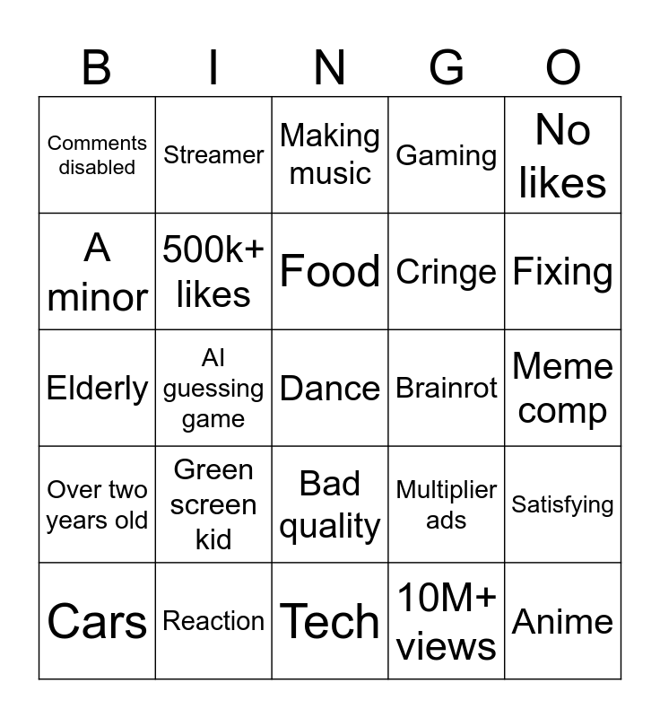 This bingo card has a free space and 24 words: Green screen kid, Reaction, Food, Cars, No likes, Comments disabled, A minor, Streamer, Brainrot, Bad quality, Cringe, Elderly, Multiplier ads, Satisfying, 500k+ likes, 10M+ views, Meme comp, Making music, Fixing, AI guessing game, Anime, Over two years old, Gaming and Tech.