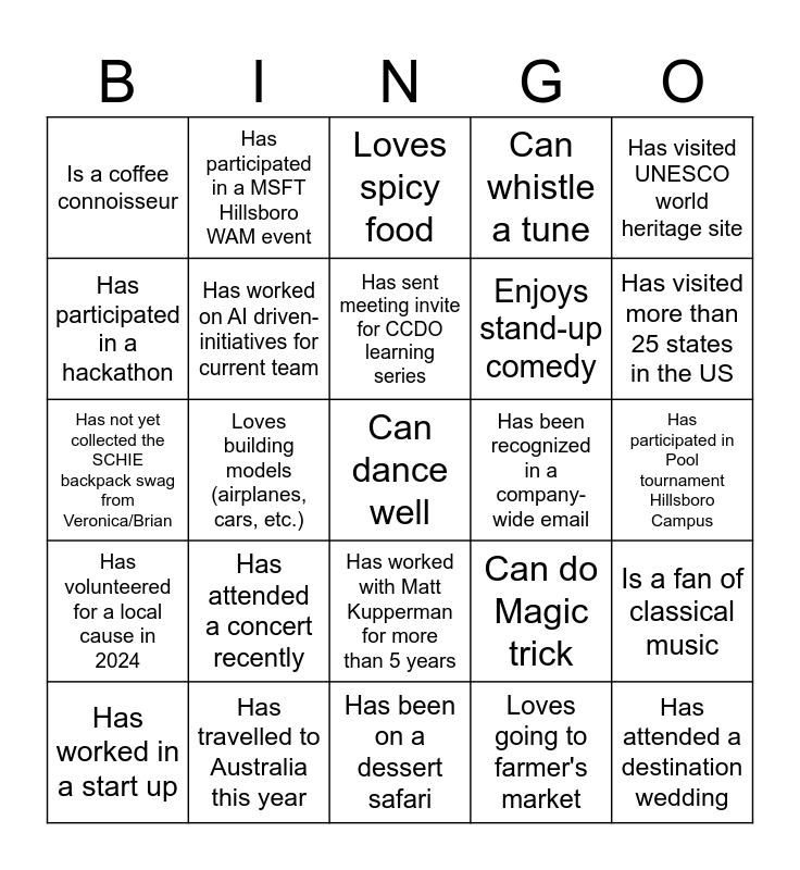 This bingo card has a free space and 24 words: Has attended a concert recently, Has travelled to Australia this year, Has sent meeting invite for CCDO learning series, Has worked in a start up, Has visited UNESCO world heritage site, Is a coffee connoisseur, Has participated in a hackathon, Has participated in a MSFT Hillsboro WAM event, Has been recognized in a company-wide email, Has worked with Matt Kupperman for more than 5 years, Enjoys stand-up comedy, Has not yet collected the SCHIE backpack swag from Veronica/Brian, Can do Magic trick, Is a fan of classical music, Has worked on AI driven- initiatives for current team, Loves going to farmer's market, Has participated in Pool tournament Hillsboro Campus, Loves spicy food, Has visited more than 25 states in the US, Loves building models (airplanes, cars, etc.), Has attended a destination wedding, Has volunteered for a local cause in 2024, Can whistle a tune and Has been on a dessert safari.
