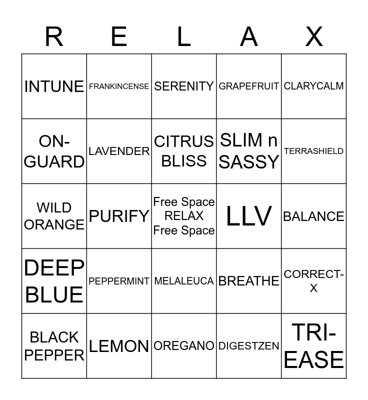 This bingo card has a free space and 24 words: PEPPERMINT, LEMON, CITRUS BLISS, BLACK PEPPER, CLARYCALM, INTUNE, ON-GUARD, FRANKINCENSE, LLV, MELALEUCA, SLIM n SASSY, WILD ORANGE, BREATHE, CORRECT-X, LAVENDER, DIGESTZEN, BALANCE, SERENITY, TERRASHIELD, PURIFY, TRI-EASE, DEEP BLUE, GRAPEFRUIT and OREGANO.