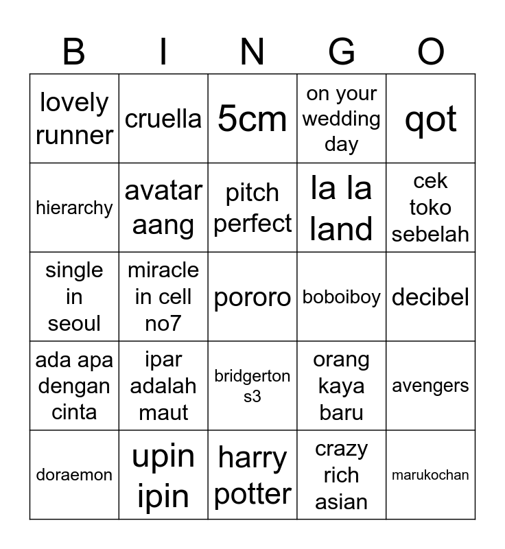 This bingo card has a free space and 24 words: doraemon, ipar adalah maut, pitch perfect, crazy rich asian, qot, lovely runner, cruella, 5cm, boboiboy, decibel, single in seoul, avatar aang, orang kaya baru, avengers, hierarchy, upin ipin, harry potter, on your wedding day, cek toko sebelah, ada apa dengan cinta, miracle in cell no7, bridgerton s3, la la land and marukochan.