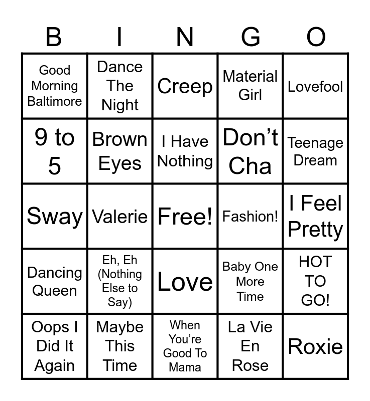 This bingo card has a free space and 45 words: Anaconda, Roxie, Cabaret, Oops I Did It Again, Blank Space, La Vie En Rose, Creep, Chandelier, Lovefool, Maybe This Time, Material Girl, Fashion!, Love, Eh, Eh (Nothing Else to Say), I Will Survive, When You’re Good To Mama, the boy is mine, Sway, It’s Not Right but It's Okay, Teenage Dream, Dance The Night, Crazy In Love, Love On Top, Good Morning Baltimore, Don’t Rain On My Parade, I Feel Pretty, There Are Worse Things I Could Do, Hopelessly Devoted To You, Baby One More Time, Dancing Queen, CUFF IT, HOT TO GO!, Mamma Mia, Dreamgirls, Paparazzi, Valerie, Candyman, Got to Be Real, It’s All Coming Back To Me Now, I Have Nothing, 9 to 5, Don’t Cha, Last Dance, Brown Eyes and Hold My Hand.