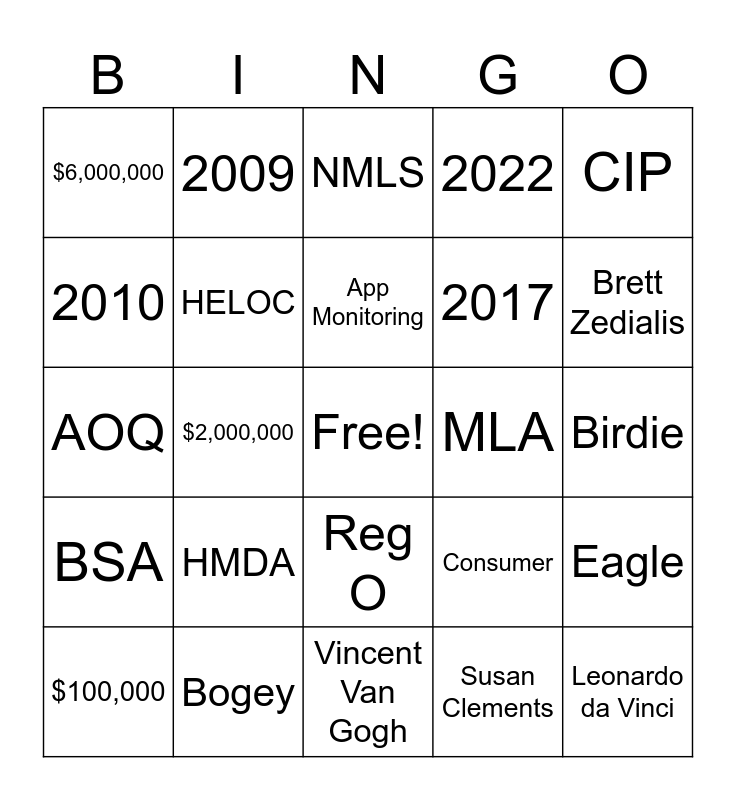 This bingo card has a free space and 29 words: $100,000, $1,000,000, $2,000,000, 98, $6,000,000, NMLS, HELOC, HMDA, MLA, Bogey, Birdie, Leonardo da Vinci, Vincent Van Gogh, Susan Clements, Brett Zedialis, Kevin Hester, Reg O, BSA, CIP, AOQ, Consumer, Commercial, 2017, 2010, 2022, 2009, Eagle, App Monitoring and Vendor Order.