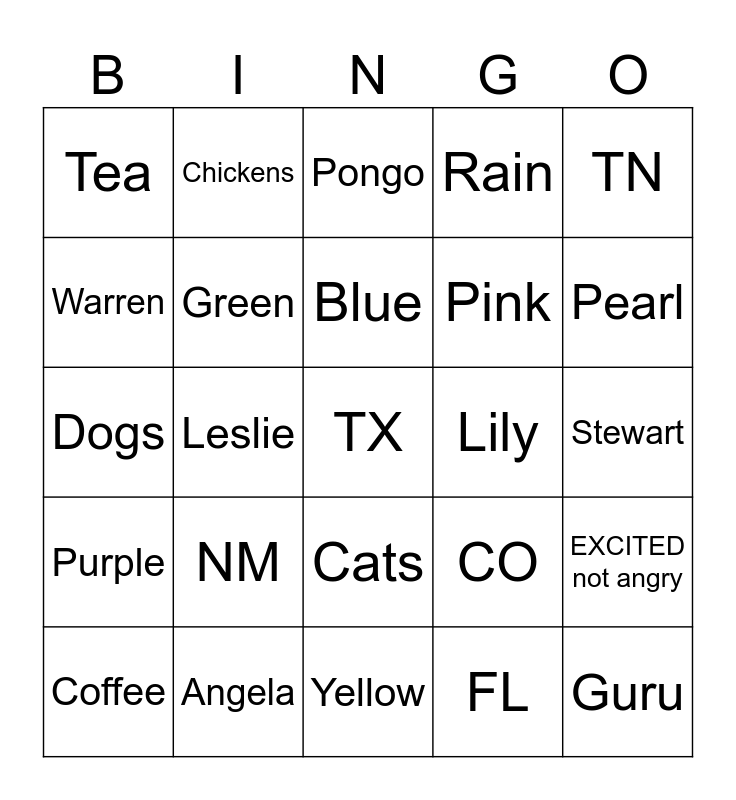This bingo card has 25 words: NM, Yellow, Blue, Coffee, TN, Tea, Warren, Chickens, Lily, Cats, Pink, Dogs, CO, EXCITED not angry, Green, Guru, Stewart, Pongo, Pearl, Leslie, TX, Angela, Purple, Rain and FL.