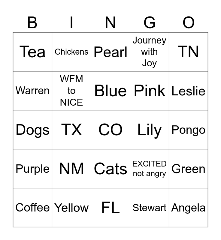 This bingo card has a free space and 24 words: NM, Yellow, Blue, Coffee, TN, Tea, Warren, Chickens, Lily, Cats, Pink, Dogs, EXCITED not angry, Green, WFM to NICE, Stewart, Pongo, Pearl, Leslie, TX, Angela, Purple, Journey with Joy and FL.