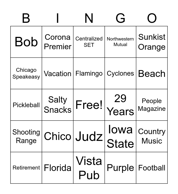This bingo card has a free space and 26 words: Judz, Purple, Flamingo, Florida, Sunkist Orange, Bob, Chicago Speakeasy, Corona Premier, People Magazine, Iowa State, Cyclones, Pickleball, Country Music, Retirement, Salty Snacks, 020, Northwestern Mutual, Shooting Range, Centralized SET, Football, Beach, Vista Pub, 29 Years, Chico, Vacation and Cruise Ship.