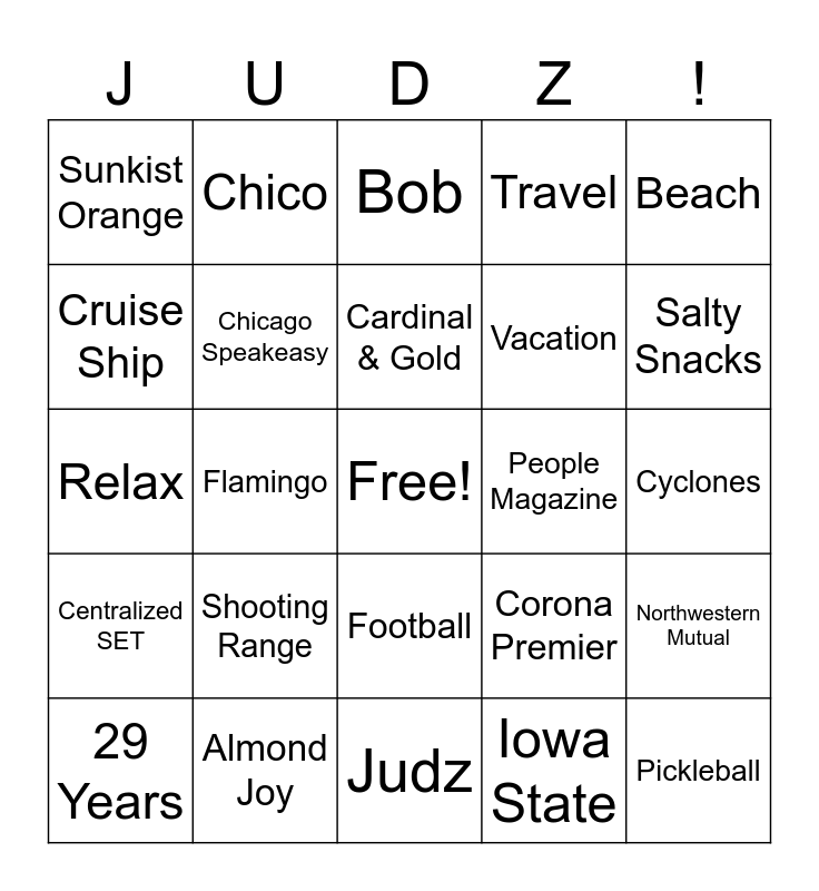 This bingo card has a free space and 31 words: Judz, Purple, Flamingo, Florida, Sunkist Orange, Bob, Chicago Speakeasy, Corona Premier, People Magazine, Iowa State, Cyclones, Pickleball, Country Music, Retirement, Salty Snacks, 020, Northwestern Mutual, Shooting Range, Centralized SET, Football, Beach, Vista Pub, 29 Years, Chico, Vacation, Cruise Ship, Travel, Relax, Almond Joy, Cardinal & Gold and Colorful Hair.