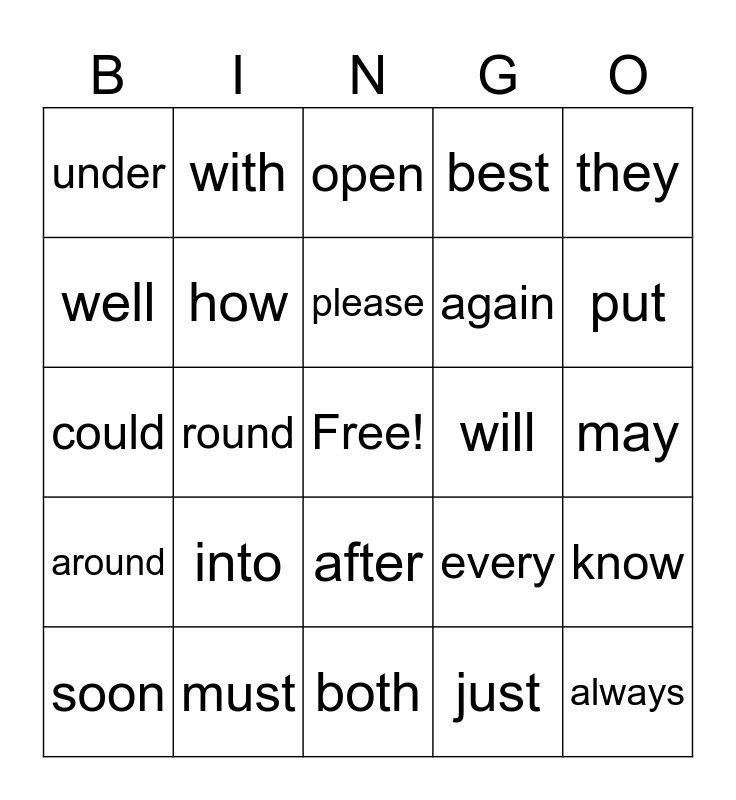 This bingo card has a free space and 24 words: into, must, please, soon, they, under, well, with, will, after, again, could, every, know, how, just, may, open, put, round, always, around, best and both.