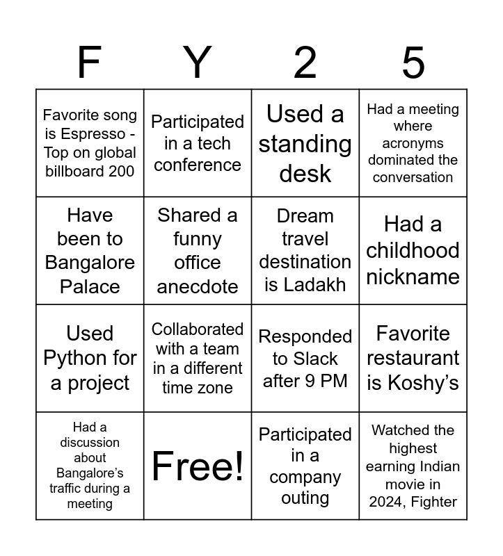 This bingo card has 16 words: Free!, Favorite restaurant is Koshy’s, Used a standing desk, Favorite song is Espresso - Top on global billboard 200, Used Python for a project, Participated in a tech conference, Responded to Slack after 9 PM, Participated in a company outing, Have been to Bangalore Palace, Shared a funny office anecdote, Had a discussion about Bangalore’s traffic during a meeting, Had a meeting where acronyms dominated the conversation, Collaborated with a team in a different time zone, Had a childhood nickname, Dream travel destination is Ladakh and Watched the highest earning Indian movie in 2024, Fighter.