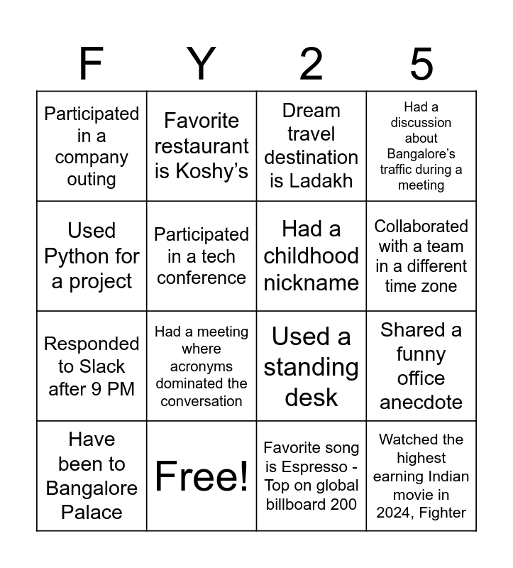 This bingo card has 16 words: Free!, Shared a funny office anecdote, Dream travel destination is Ladakh, Participated in a company outing, Responded to Slack after 9 PM, Favorite restaurant is Koshy’s, Used a standing desk, Favorite song is Espresso - Top on global billboard 200, Used Python for a project, Participated in a tech conference, Have been to Bangalore Palace, Had a discussion about Bangalore’s traffic during a meeting, Had a meeting where acronyms dominated the conversation, Collaborated with a team in a different time zone, Had a childhood nickname and Watched the highest earning Indian movie in 2024, Fighter.