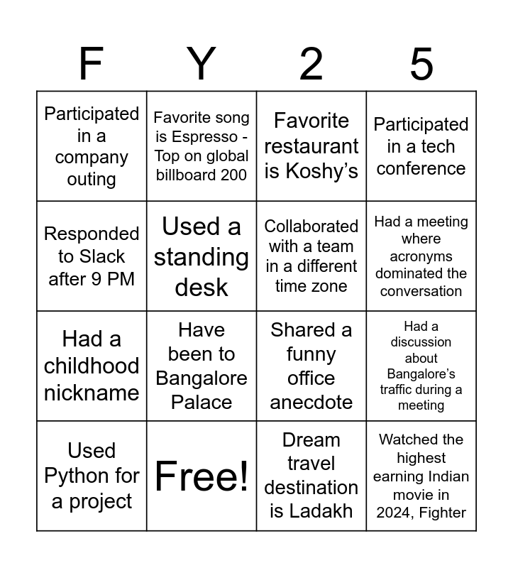This bingo card has 16 words: Free!, Had a discussion about Bangalore’s traffic during a meeting, Favorite restaurant is Koshy’s, Participated in a company outing, Had a childhood nickname, Favorite song is Espresso - Top on global billboard 200, Shared a funny office anecdote, Dream travel destination is Ladakh, Responded to Slack after 9 PM, Used a standing desk, Used Python for a project, Participated in a tech conference, Have been to Bangalore Palace, Had a meeting where acronyms dominated the conversation, Collaborated with a team in a different time zone and Watched the highest earning Indian movie in 2024, Fighter.