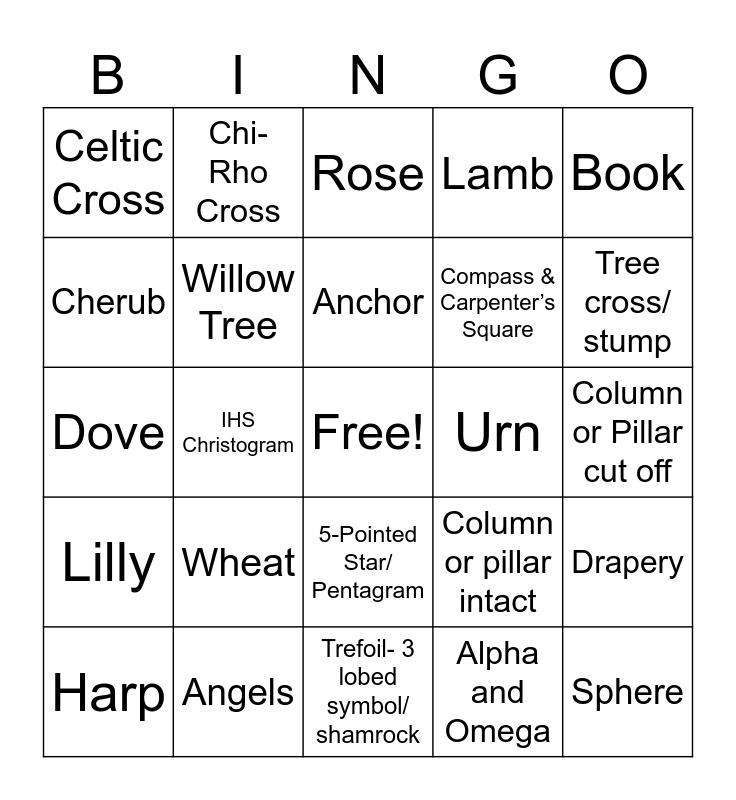 This bingo card has a free space and 26 words: 5-Pointed Star/ Pentagram, Alpha and Omega, Anchor, Angels, Book, Celtic Cross, Cherub, Chi-Rho Cross, Column or Pillar cut off, Column or pillar intact, Compass & Carpenter’s Square, Dove, Drapery, Harp, IHS Christogram, Ivy, Lamb, Lilly, Rose, Sphere, Tree cross/ stump, Trefoil- 3 lobed symbol/ shamrock, Urn, Wheat, Willow Tree and Wreath.