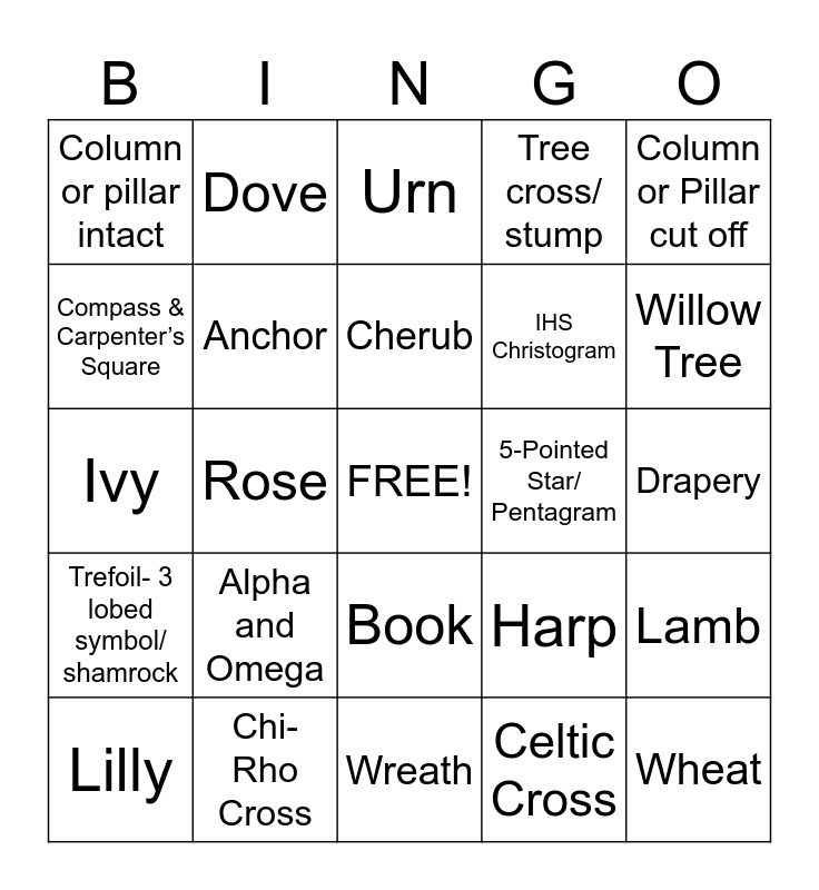 This bingo card has a free space and 26 words: Book, Celtic Cross, Cherub, Chi-Rho Cross, Column or Pillar cut off, Column or pillar intact, Compass & Carpenter’s Square, Dove, Drapery, Harp, IHS Christogram, Ivy, Lamb, Lilly, Rose, Sphere, Tree cross/ stump, Trefoil- 3 lobed symbol/ shamrock, Urn, Wheat, Willow Tree, Wreath, 5-Pointed Star/ Pentagram, Alpha and Omega, Anchor and Angels.