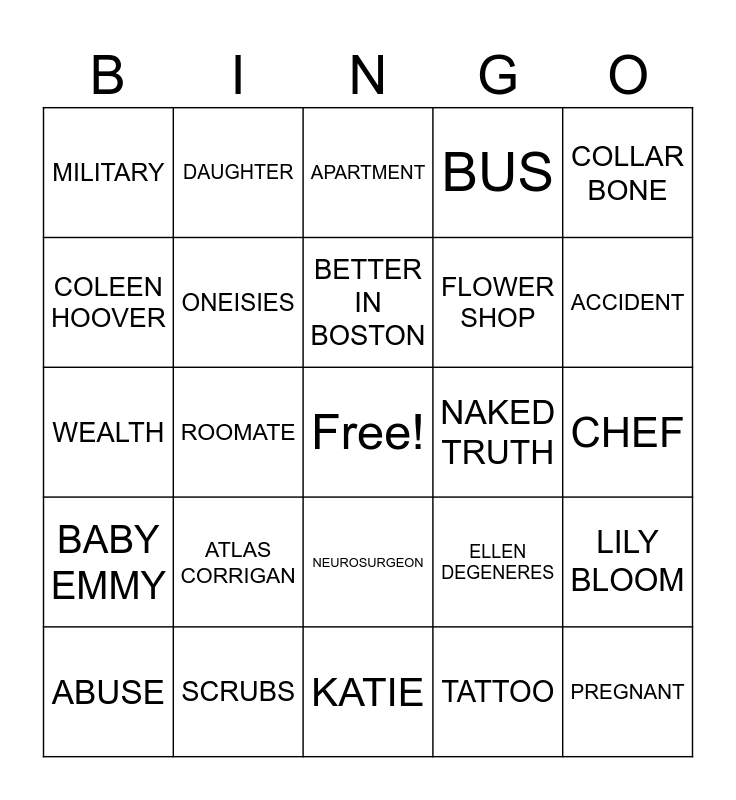 This bingo card has a free space and 24 words: ATLAS CORRIGAN, SCRUBS, BETTER IN BOSTON, ABUSE, COLLAR BONE, MILITARY, COLEEN HOOVER, DAUGHTER, NAKED TRUTH, NEUROSURGEON, FLOWER SHOP, WEALTH, ELLEN DEGENERES, LILY BLOOM, ONEISIES, TATTOO, CHEF, APARTMENT, ACCIDENT, ROOMATE, PREGNANT, BABY EMMY, BUS and KATIE.