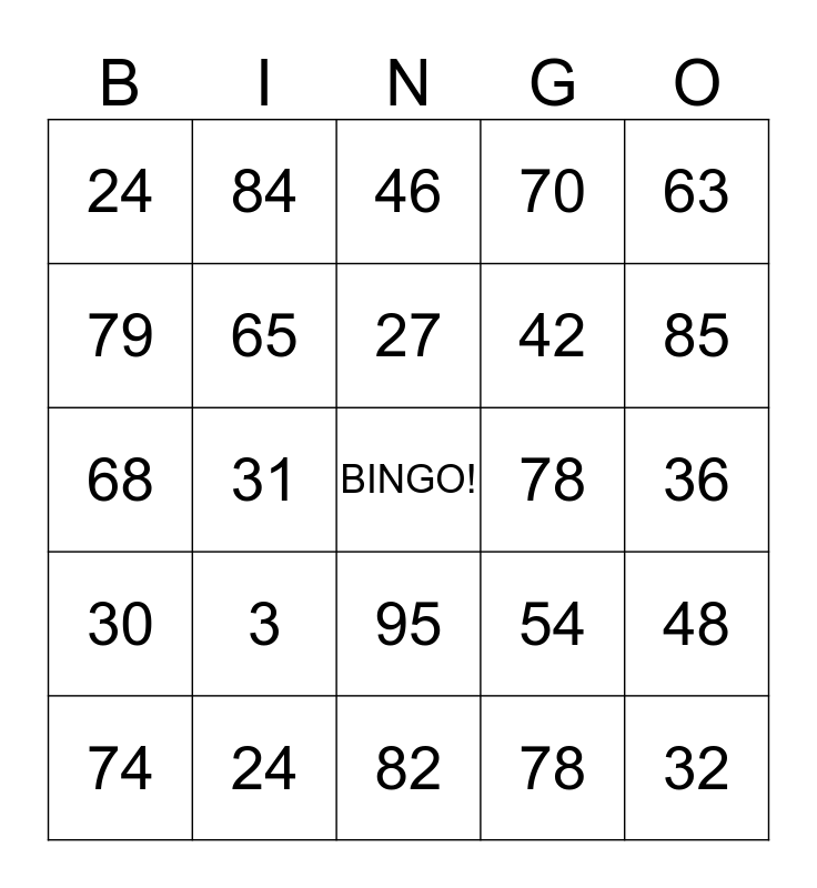 This bingo card has a free space and 24 words: 3, 24, 27, 74, 63, 24, 79, 84, 78, 95, 42, 68, 54, 48, 65, 78, 36, 46, 85, 31, 32, 30, 70 and 82.
