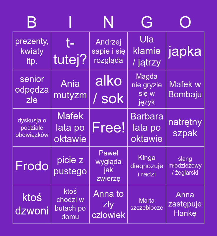 This bingo card has a free space and 24 words: picie z pustego, ktoś chodzi w butach po domu, alko / sok, ktoś dzwoni, japka, prezenty, kwiaty itp., senior odpędza złe, t-tutej?, Barbara lata po oktawie, Paweł wygląda jak zwierzę, Magda nie gryzie się w język, dyskusja o podziale obowiązków, Kinga diagnozuje i radzi, slang młodzieżowy / żeglarski, Ania mutyzm, Marta szczebiocze, natrętny szpak, Andrzej sapie i się rozgląda, Mafek w Bombaju, Mafek lata po oktawie, Anna zastępuje Hankę, Frodo, Ula kłamie / jątrzy and Anna to zły człowiek.