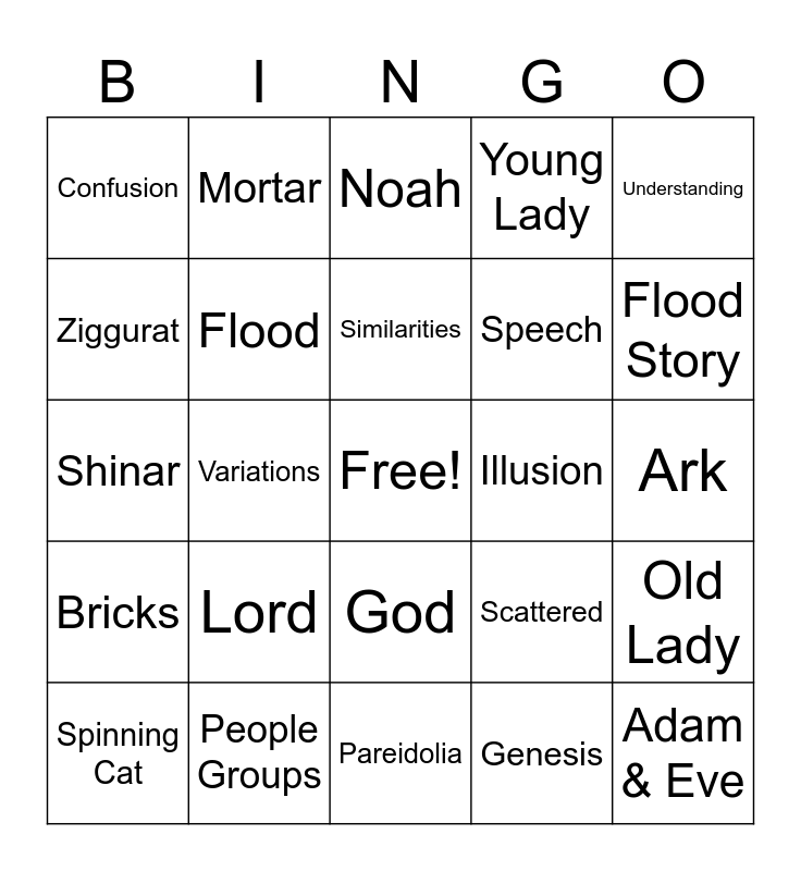 This bingo card has a free space and 30 words: People Groups, Language Groups, Variations, Tower, Confusion, Noah, Flood, God, Illusion, Pareidolia, Ark, Adam & Eve, Genesis, Race, Flood Story, Communication, Scattered, Bricks, Lord, Understanding, Shinar, City, Mortar, Speech, Ziggurat, Young Lady, Old Lady, Spinning Cat, Similarities and Differences.